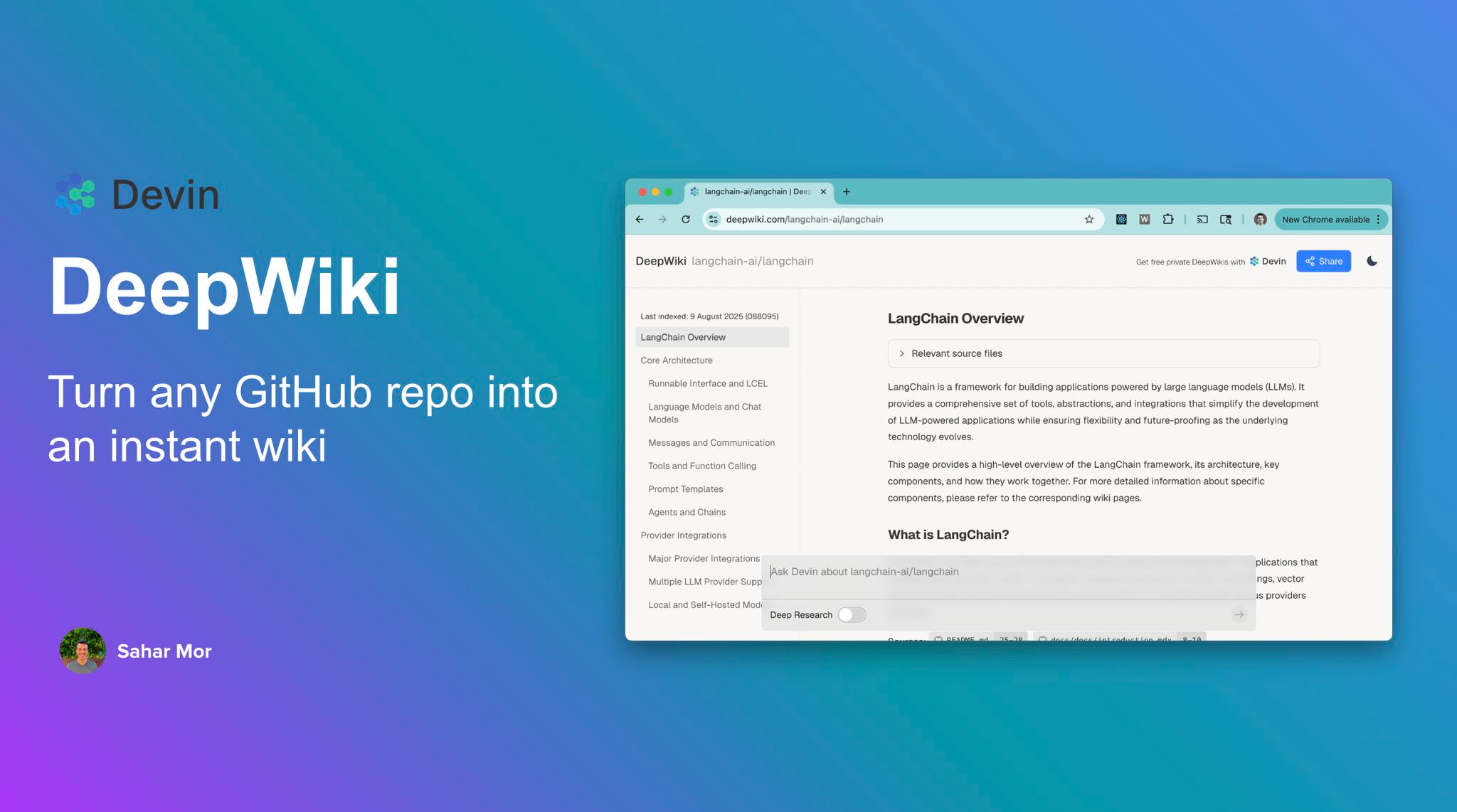 DeepWiki, from the team behind Devin the coding agent, turns any GitHub repository into an instant wiki. Replace github.com with deepwiki.com in any repo URL and start asking questions without digging through files.